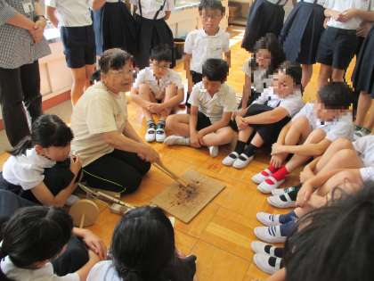本日、大阪府立弥生文化博物館から「楽しい考古学—弥生時代の生活」という単元で、出前授業に来ていただきました。プログラムは「火おこし体験」です。
