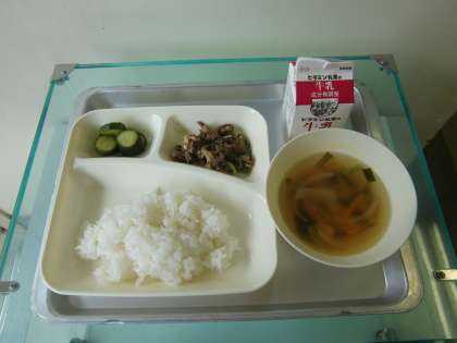 チンジャオニューロウスー・ハムと野菜の中華スープ・きゅうりの辛みづけ・ご飯・牛乳です。