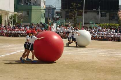 「大玉ころがし」では子どもたちよりずっと大きい大玉を、協力しながら転がして行きます。「光のシグナル」では可愛いダンスを披露しました。