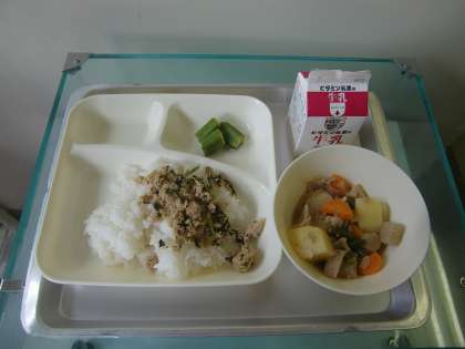 豚肉とじゃがいもの煮もの・オクラの甘酢あえ・ツナっ葉いため・ご飯・牛乳です。