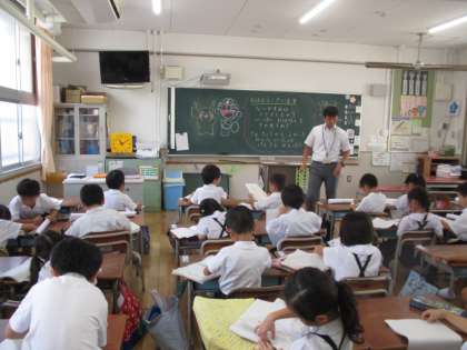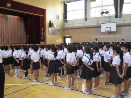 始業式では校長先生や生活指導の先生から、夏休みのくらしや2学期に向けての抱負についてお話がありました。子どもたちは静かに話を聞くことができました。