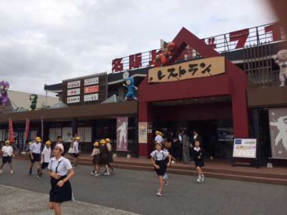 空は曇っていますが、子ども達は皆元気です。上野ドライブインでのトイレ休憩が終わり、バスの中でおやつタイムが始まりました。