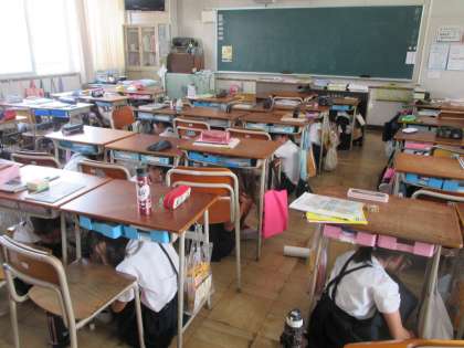 11時の防災無線で訓練が始まると、子どもたちはまず、机の下に身を潜めて頭を守ります。