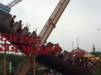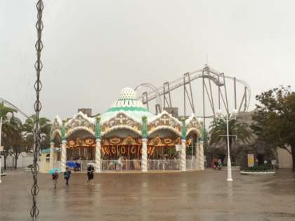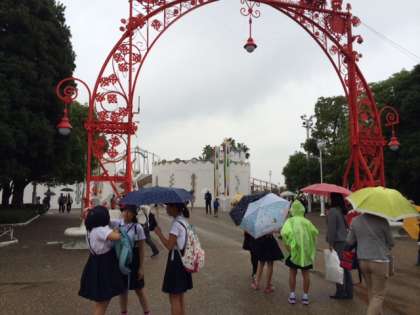 子どもたちはスペイン村で班ごとに活動中ですが、あいにく雨は降り続いています。ジェットコースターのピレネーは動いていません。傘をさしながら、園内を回っています。(14:36現在)