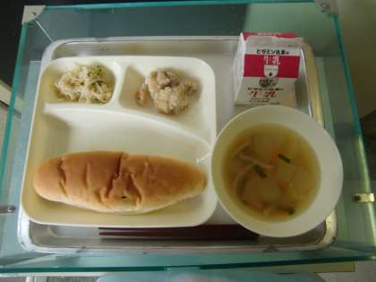 鶏肉のからあげ・とうがんの中華スープ・切り干しだいこんのごま辛みづけ・レーズンパン・牛乳です。