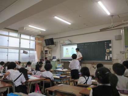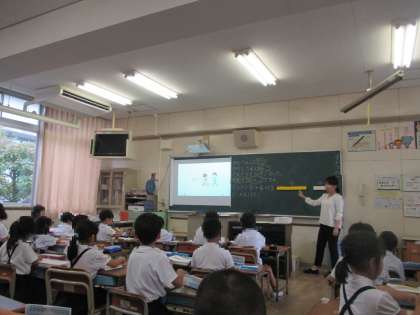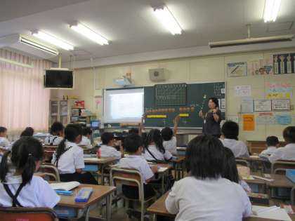 各クラスとも、「どんぐりは あわせて いくつあるでしょう」という繰り上がりのあるたし算の問題をどうやって解くのかを考えていました。手を挙げて、自分の考え方を積極的に発表する子どもたちがたくさんいました。