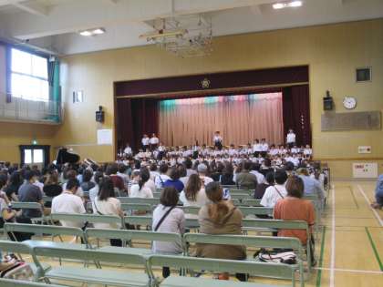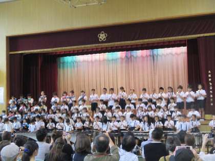 「友だちシンドバッド」の合唱で始まり、「10年間の思い出」や「将来の夢」「家族へ」のスピーチをはさんで、「崖の上のポニョ」「勇気100パーセント」「となりのトトロ」の合奏をしました。