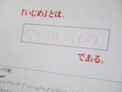 授業の最後には、「いじめとは・・・命をうばうものである」と考えられるようになりました。子どもたちの中で、「いじめといのち」が結びついた授業でした。