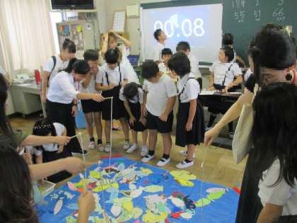 教室にできた池に泳ぐ魚を、磁石のついた釣り竿で釣りあげます。