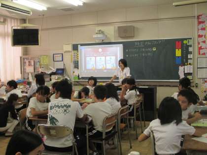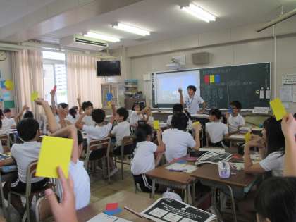 6年生は、「OSAKA防災タイムアタック」という教材を使って防災の学習をしました。南海トラフ巨大地震が起きた時、どう行動するべきか等が三択クイズとなっており、一人一人が答えを考えて、カードで示します。難しい問題もありましたが、なぜそう行動するのか・・・子どもたちは自分なりの考えもきちんと発表していました。参観されている保護者の皆さんも子どもたちと一緒に深く考えておられました。