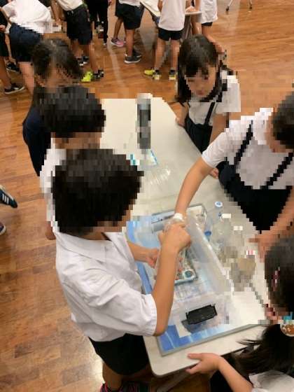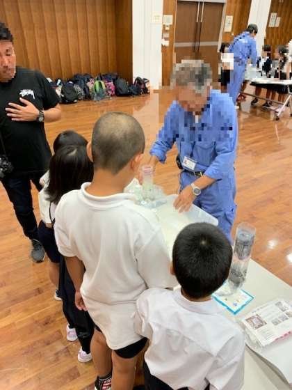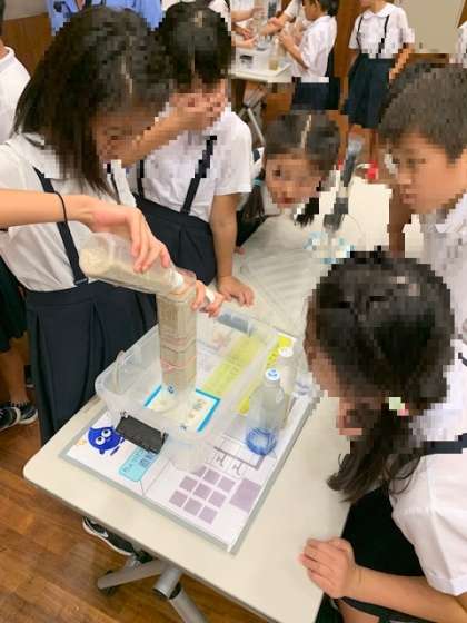 泥で汚れた水をペットボトルで作った濾過装置を使ってきれいにする実験です。