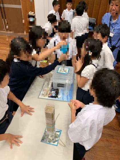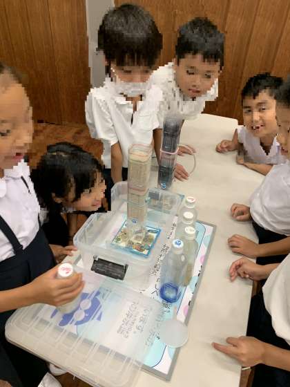 実験は、みんなで協力しながら行っています。上手くきれいな水が作れるかな?