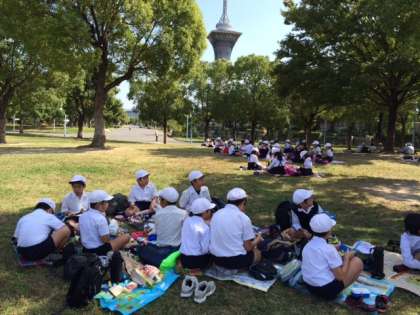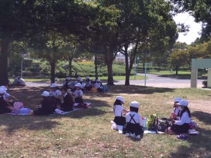 見学の後は待ちに待ったお弁当タイムです。青空の下で食べるお弁当の味は、格別です。