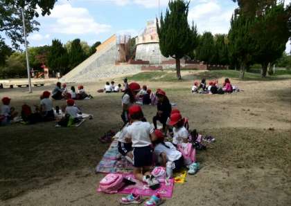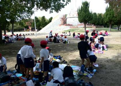 遊んだあとは、お弁当の時間です。冒険広場は今でも貸切状態なので、子どもたちは広々と好きな場所を選んでお弁当を食べています。