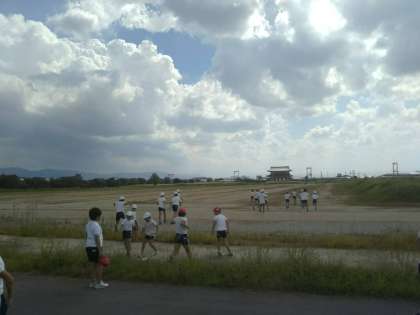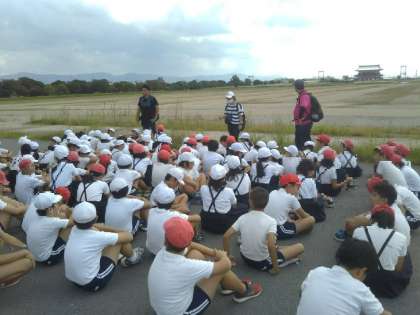 走り回る児童、草むらで昆虫採集する児童、みんな思い思いに過ごしています。