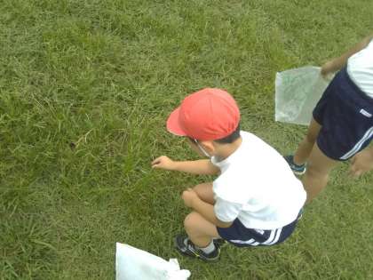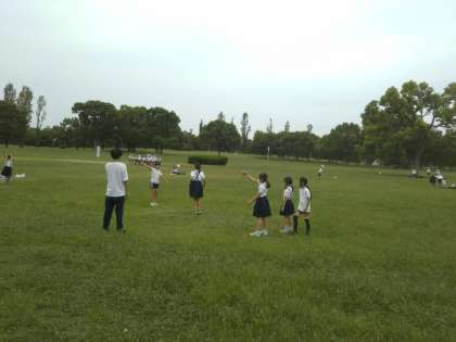 広い芝生広場で、ドッジボールを楽しむグループ、昆虫採集するグループ、側転や体操をするグループ、鬼ごっこをするグループ、みんな楽しく過ごしています。