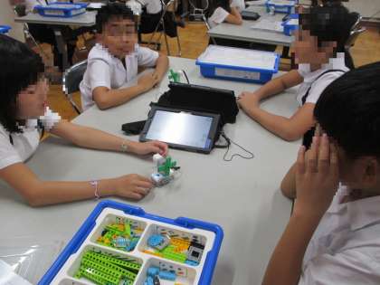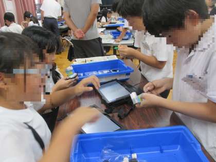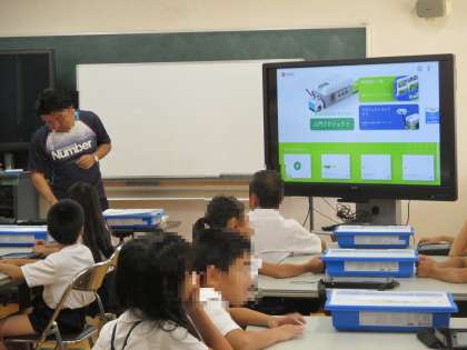 片江小学校では、今年度、校長経営戦略予算でプログラミング教材を購入しました。今日は4年生が、その教材を早速使用して学習していました。