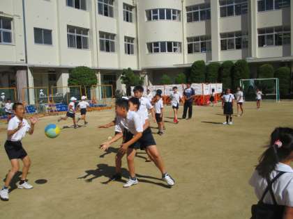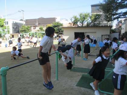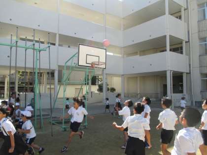 多くの子どもたちが、ドッジボール、バスケットボール、バレーボール、鬼ごっこ、鉄棒、登り棒、うんてい、一輪車などなど色んなことをして運動場で所狭しと遊んでいます。
