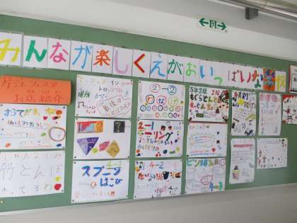 これまで運営委員が中心となって、片江フェスタに向けてのムードを盛り上げてくれました。玄関の掲示板には、各クラスのお店のポスターがずらりと並んでいます。