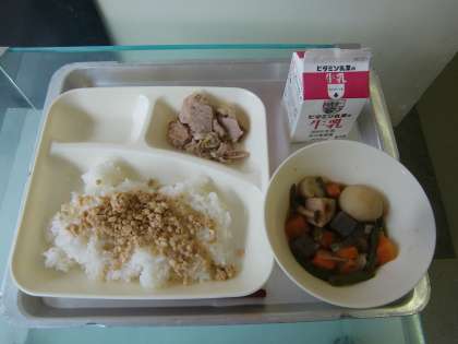 豚肉のねぎじょうゆ焼き・ふきよせ煮・ツナ大豆そぼろ・ご飯・牛乳です。
