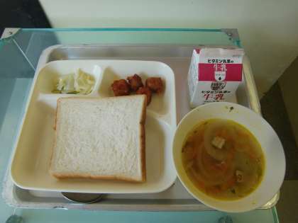 まぐろのオーロラ煮・ベーコンとじゃがいものスープ・キャベツのゆずドレッシング・食パン・牛乳です。