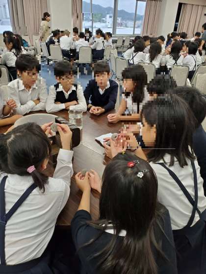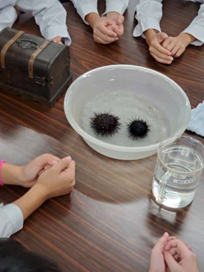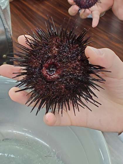 生きているウニを触って、ウニの口を探したり、海水をかけてウニの足や吸盤を働かせたりしました。