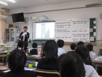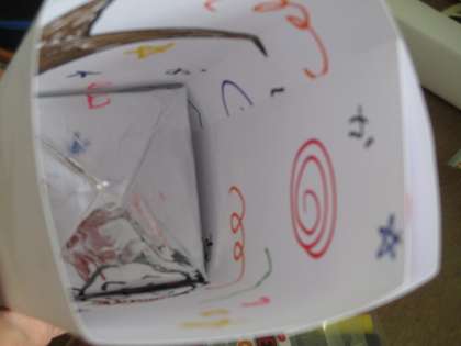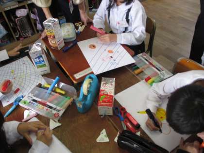 牛乳パックの入り口のところに、銀色の折り紙を貼り、画用紙に描いた絵を牛乳パックの周りに巻きます。中をのぞきながら牛乳パックを引っ張ると・・・キラキラ模様が光る素敵な万華鏡のできあがりです。身近なものを使ってできる楽しい工作でした。