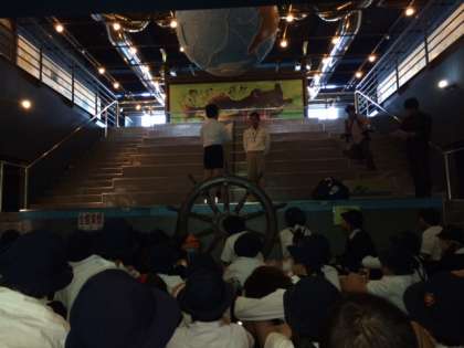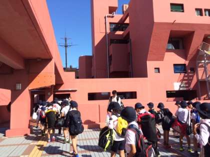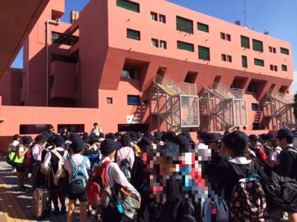 予定より30分ほど早く、宿泊先の「海洋センター」に到着しました。みんな元気な様子です。早速、入所式を行いました。(10:10現在)