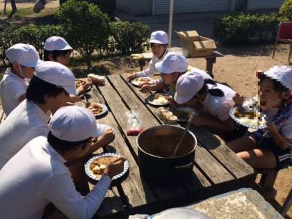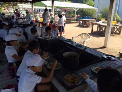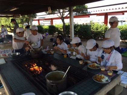 カレーライスが出来上がりました。どの班も大成功で、とても美味しそうです。自分たちで作ったカレーライスを美味しそうに食べています。(12:40現在)