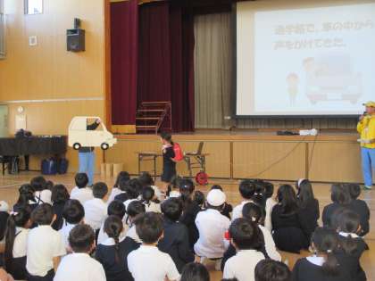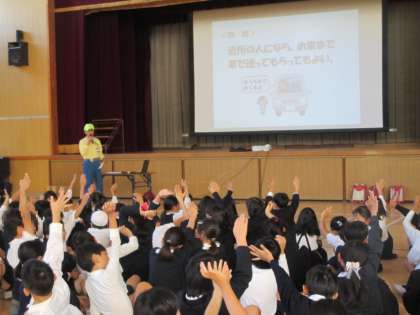また、怪しい人に声をかけられたり、連れて行かれそうになった時、どのようにして逃ればいいのかを考え、各クラスの代表の児童が実際に体験する場面もありました。