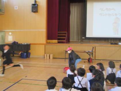 逃げ切るためには、大声を出すこと、防犯ブザーがあれば使うこと、ランドセルは置いてでも逃げることが大切だということをどの子もしっかり理解できたようでした。