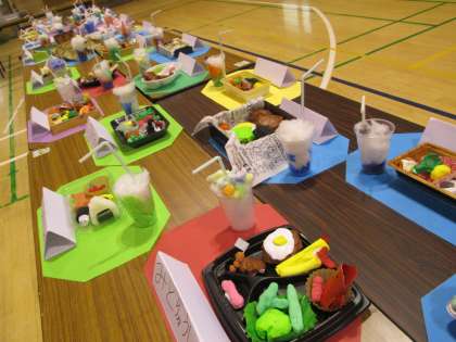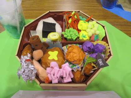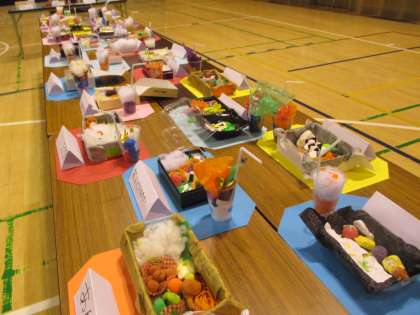 お家から持ってきた、箱や容器をお弁当箱に見立てて、中に自分の好きな材料で思い思いのおかずを詰めました。どのお弁当もとっても美味しそう。なんとドリンク付き!とても贅沢なおべんとうパーティーになりました。