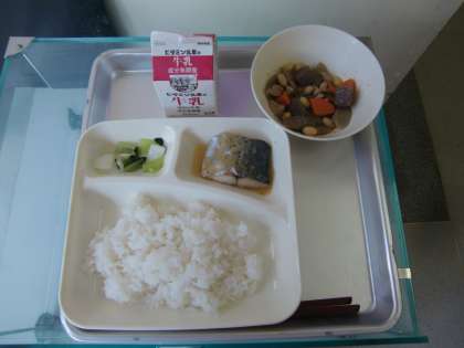 さごしのおろしじょうゆかけ・五目豆・こまつなとはくさいの甘酢あえ・ご飯・牛乳です。