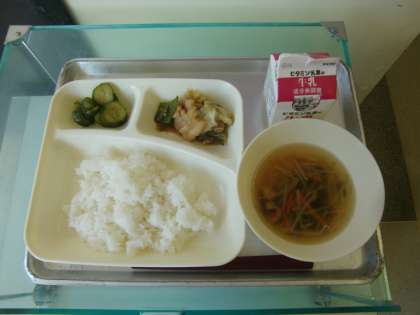 ホイコウロー・中華スープ・きゅうりの辛みづけ・ご飯・牛乳です。