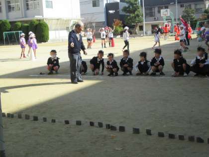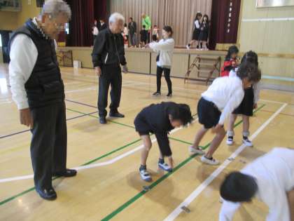 「かわらなげ」とは、割れた「かわら」を立てて一列に並べ、別の「かわら」を投げて倒すというもです。なかなか難しいようでしたが、名人が「かわら」を滑らすように投げるのを見て、子ども達は一生懸命真似ていました。今日初めて体験した昔遊びもありますが、またたくさん練習して名人に近づいて欲しいですね。