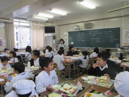 4時間目が終わると、それぞれの部屋に移動し、配膳から協力して行いました。メニューは「鶏肉のガーリックマヨネーズ焼き・スープ・富有柿・食パン・牛乳」でした。配膳していて、食パンの厚さが低学年・中学年・高学年で違うことを初めて知った子もいるようでした。