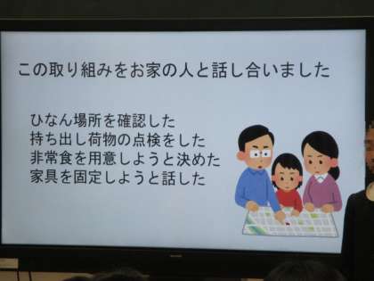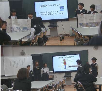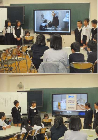 また、災害時に水が使えなくなったとき、トイレをどのように使用したらよいのかについて、学んだことをビデオ撮影したものを披露しました。さらに学校の備蓄倉庫を取材し、どのようなものが備えてあったかの報告も行いました。
