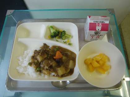 冬野菜のカレーライス・ブロッコリーとコーンのサラダ・黄桃(カット缶)・牛乳です。