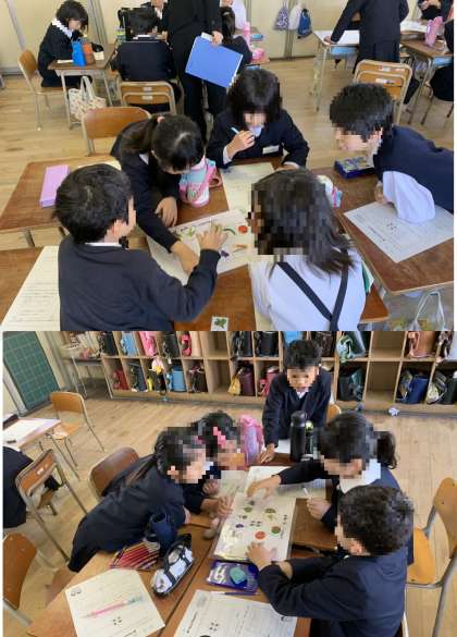 まず、グループで12種類の食べものの旬を考えて春夏秋冬にわけました。グループ内でも意見が分かれるほど、子どもたちはずいぶん悩んでいました。その後、栄養教諭の先生から正しい旬を教えていただきました。