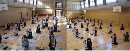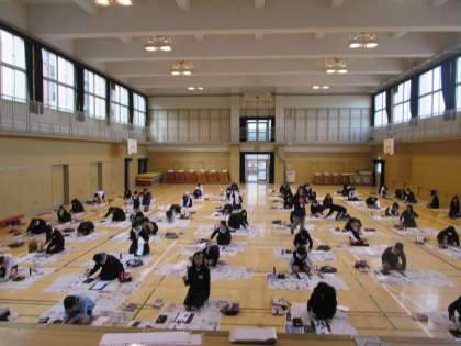 今日は、冬休みに宿題で練習してきた「希望の朝」という言葉を、講堂の床の上に、普段よりも長い半紙を広げてのびのびと書きました。どの子も集中して、真剣な表情で、納得するまで書いており、素晴らしい出来栄えでした。最後は、全員で写真撮影。みんな、字が今以上に上達しますように!!