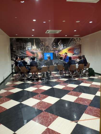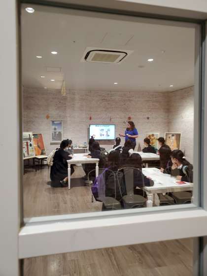 次の写真は、アートギャラリーで世界地図の色塗りをしています。