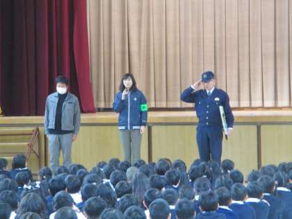訓練の後半は講堂に集まり、東成警察署防犯係の方から、自分の身を守る5つの約束についての話を聞きました。