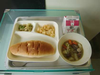 ポトフ・カレーソテー・桃のクラフティ・おさつパン・牛乳です。