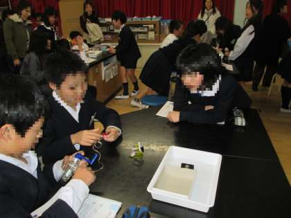 6年1組は、理科で「発電と電気の利用」でした。手回し発電機に豆電球やモーターをつなぎ、回し方を変えてその様子の違いについて調べていました。