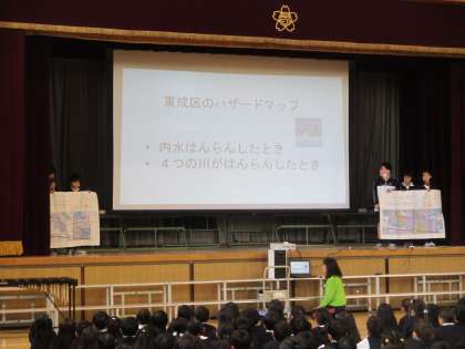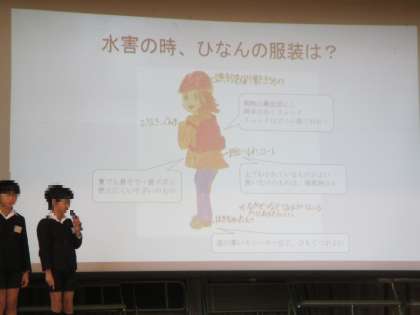 水害がおきて避難することになったとき、何を持ってどんな服装で避難すればいいのか。また、災害時に水が使えなくなったとき、トイレをどのように使用したらよいのか等について全校で学ぶことができました。
