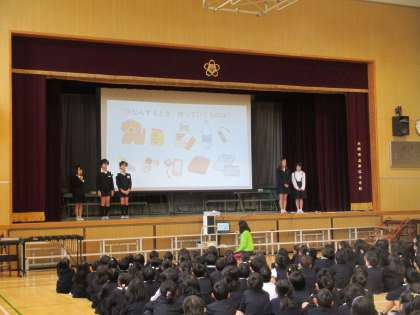 本日、インフルエンザによる学級閉鎖のため延期になっていた健康委員会の発表を臨時児童集会で行いました。内容は、12月5日に学校保健委員会で発表したテーマ「防災」についてです。(詳しくは12月5日のホームページをご覧ください。)