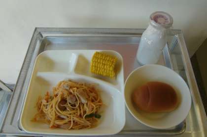チキンスパゲッティ・蒸しとうもろこし・黒糖1/2パン・牛乳