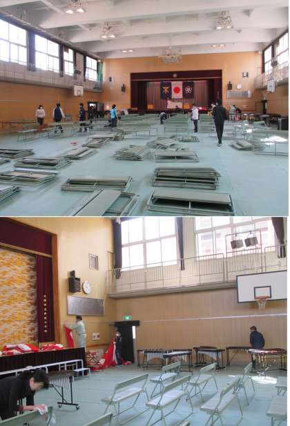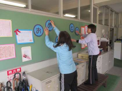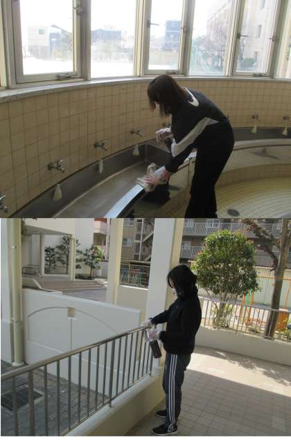 例年5年生に手伝ってもらっていますが、今年は教職員だけで頑張っています。コロナウイルス感染症予防のため、子どもたちが触りそうなところは消毒もおこないました。