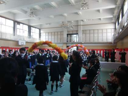 子どもたちの胸には在校生が作ってくれたメダルがかけられました。3月5日に実施するはずだったお別れ集会でプレゼントとしてもらうことになっていたものです。お花のアーチをくぐっての退場も、卒業生はとても嬉しそうでした。