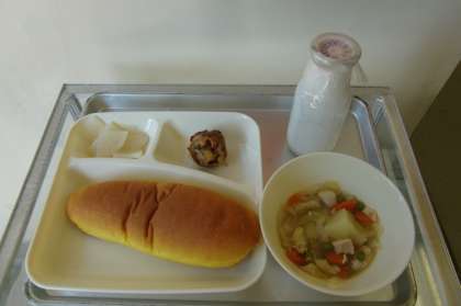 「たこボール」は子どもたちに大人気の献立です。今年度は洋風の組み合わせとなっています。